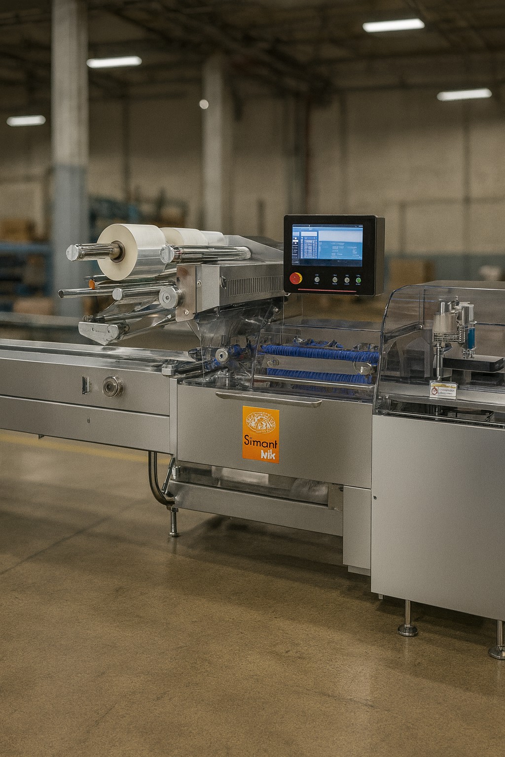 Versatile horizontal machine for biscuits, maamoul, dates, and snacks. Delivers 25 to 100 packs per minute with tight sealing.